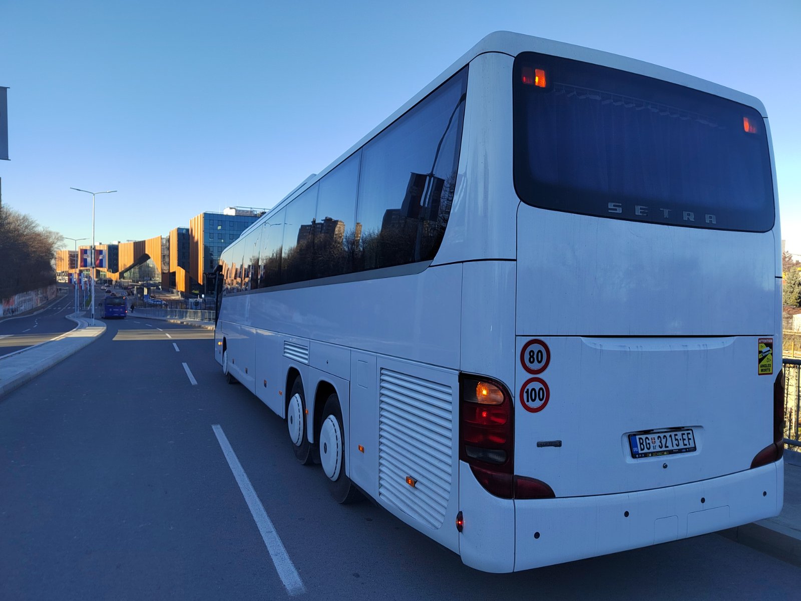 Autobus Setra sa 63 sedišta, opremljen audio/video opremom, mikrofonom, frižiderom, klimom i grejanjem.